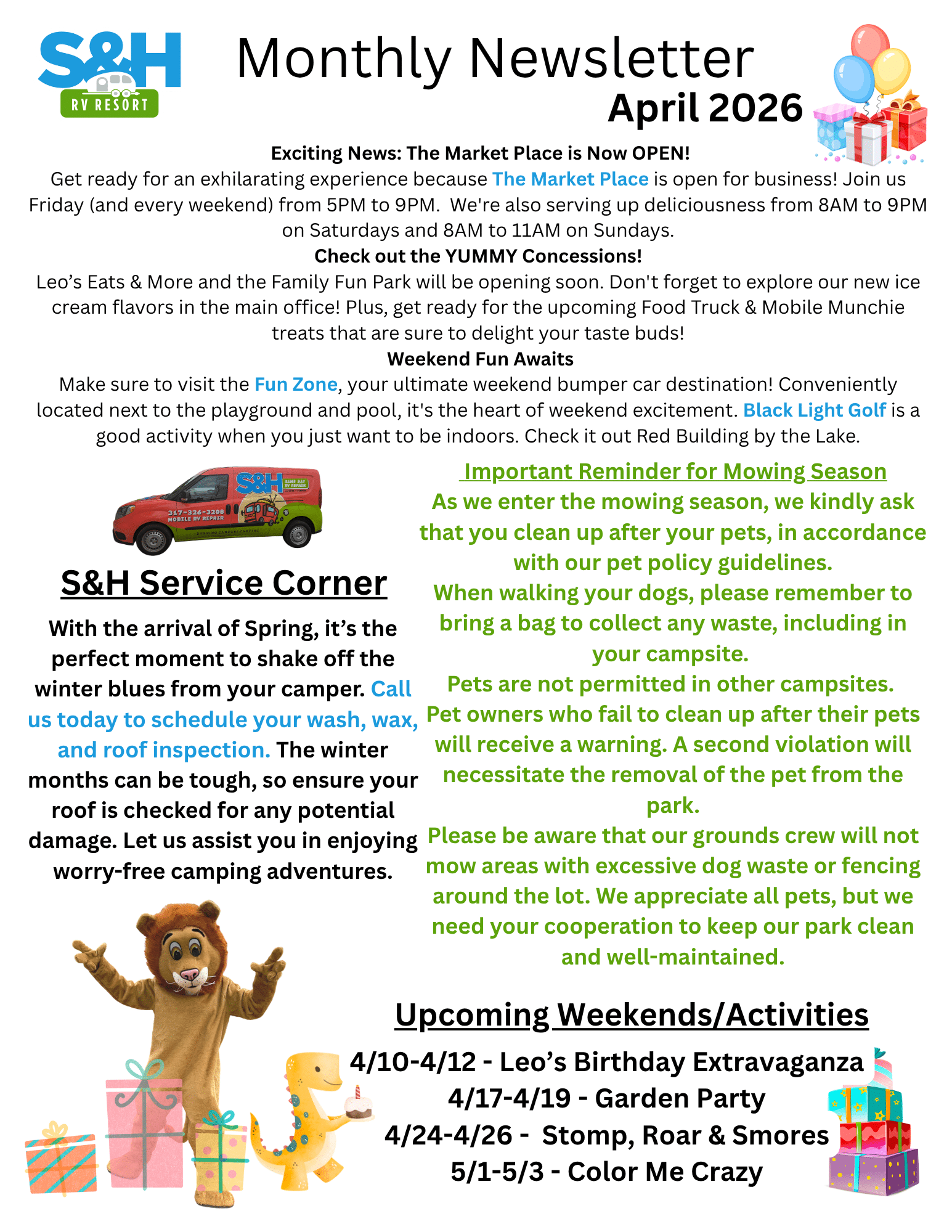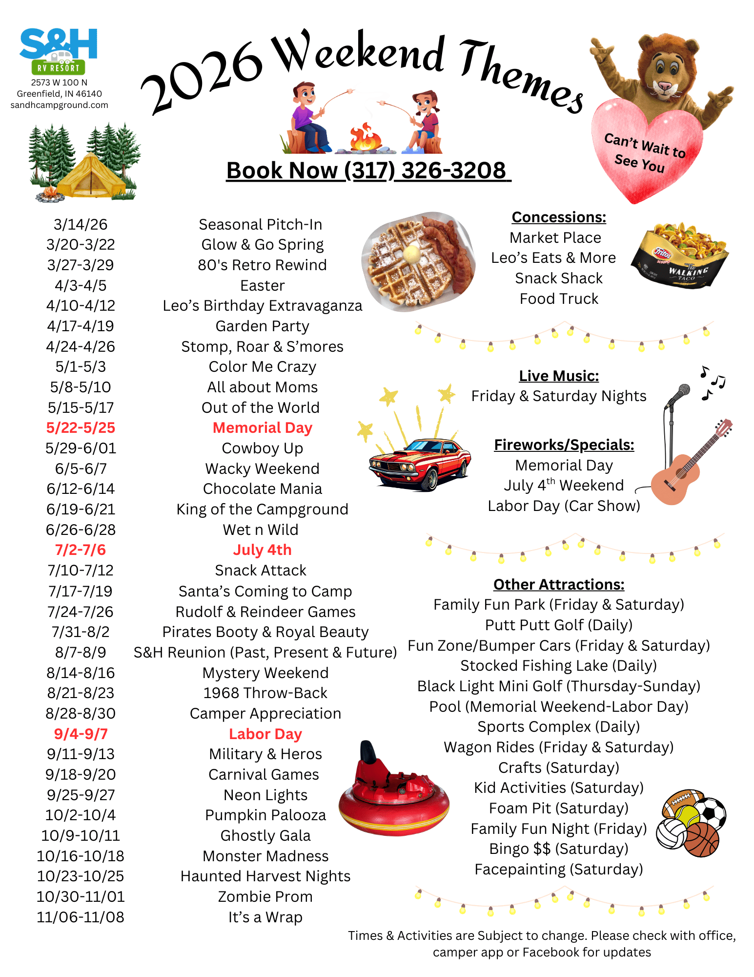 In addition to standard campground amenities and activities such as hiking, fishing, and swimming, S&H provides guests with a variety of planned events to enhance the camping experience. Ours is a family-owned campground community, and we encourage campers to share the fun through live music, outdoor movies, and even magic shows.
