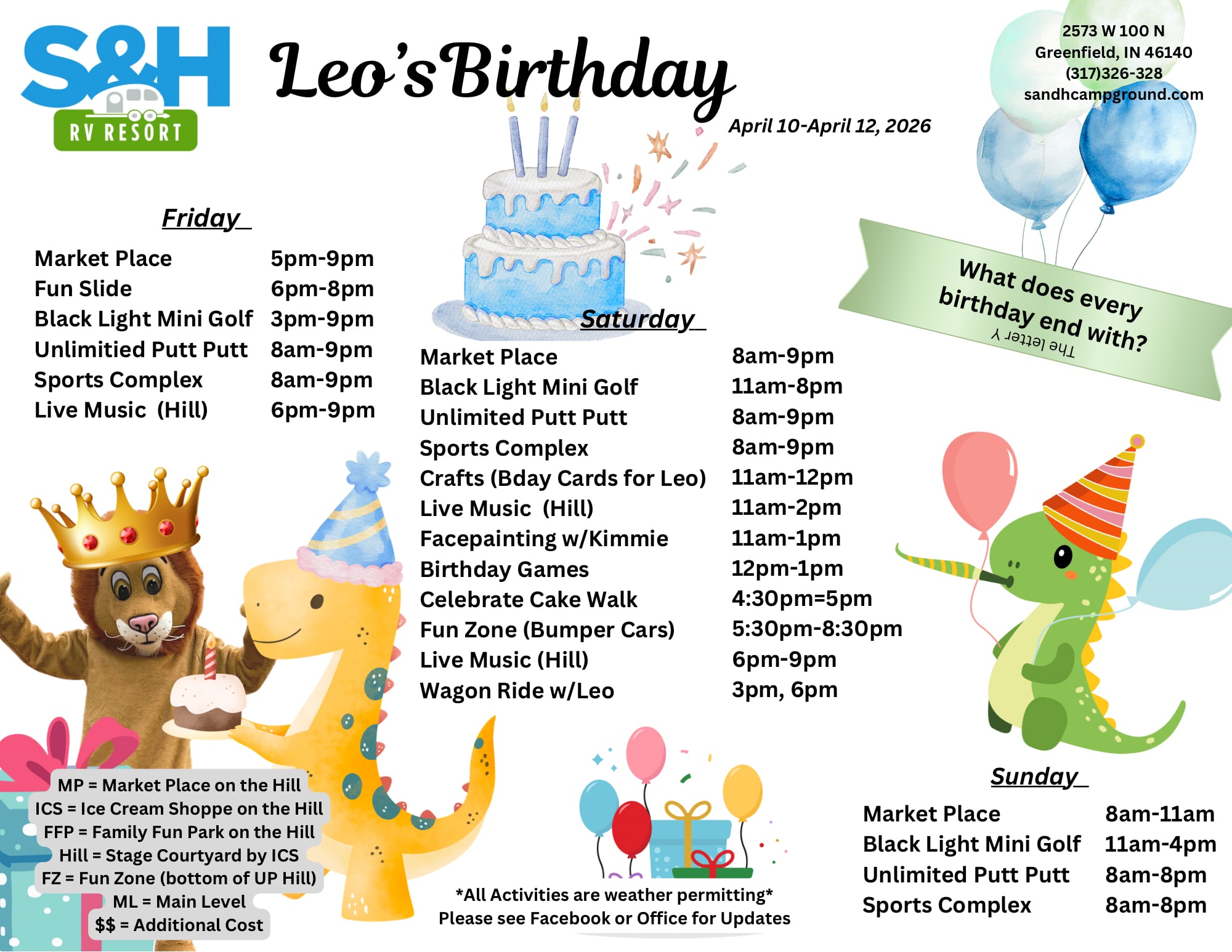 We do not offer refunds for any reason. In the event of a cancellation, we will hold any unused deposit or rental for one (1) year as a credit toward a future stay to be used at S&H Campground. For any other questions you may have, please see our FAQs or call (317) 326-3208 for more information.